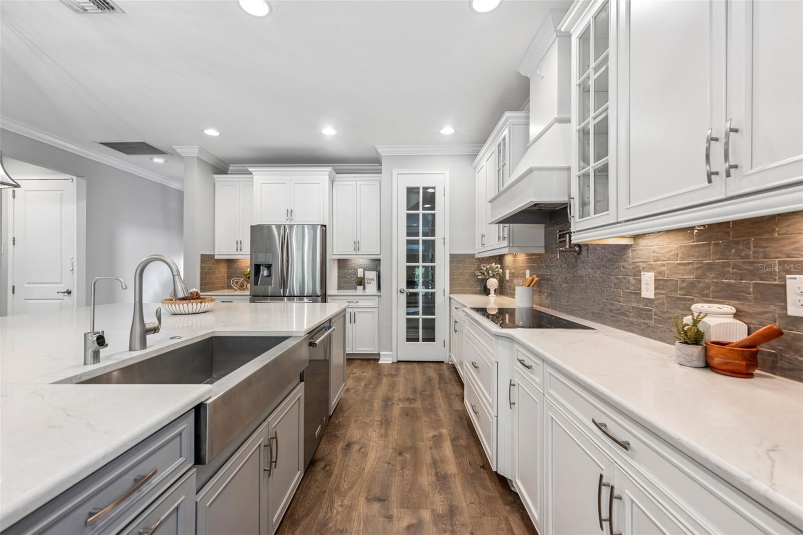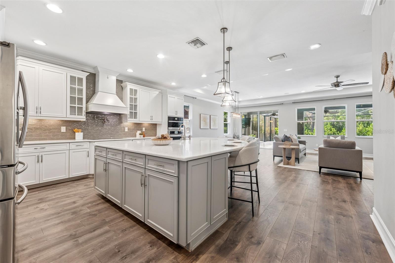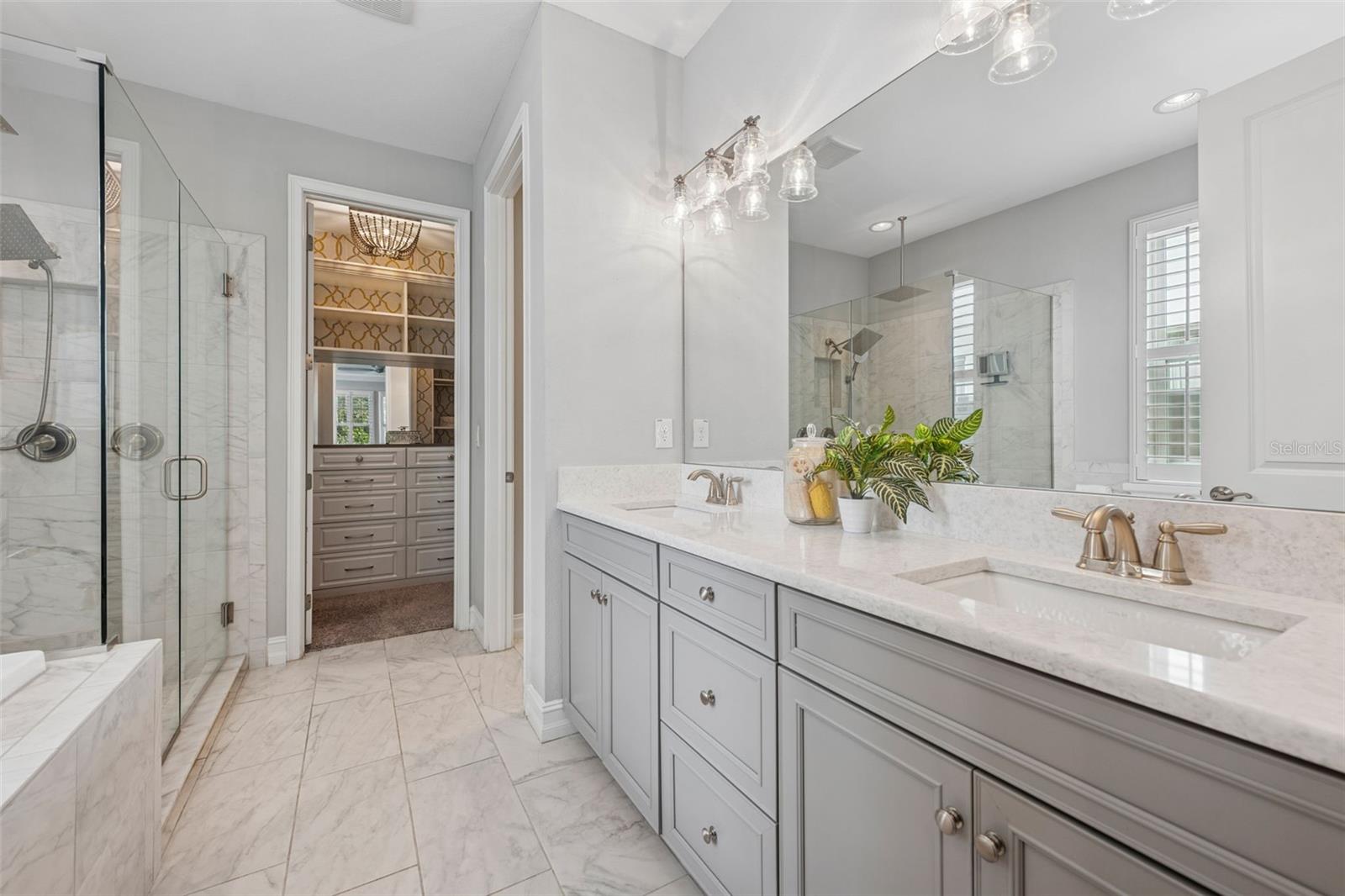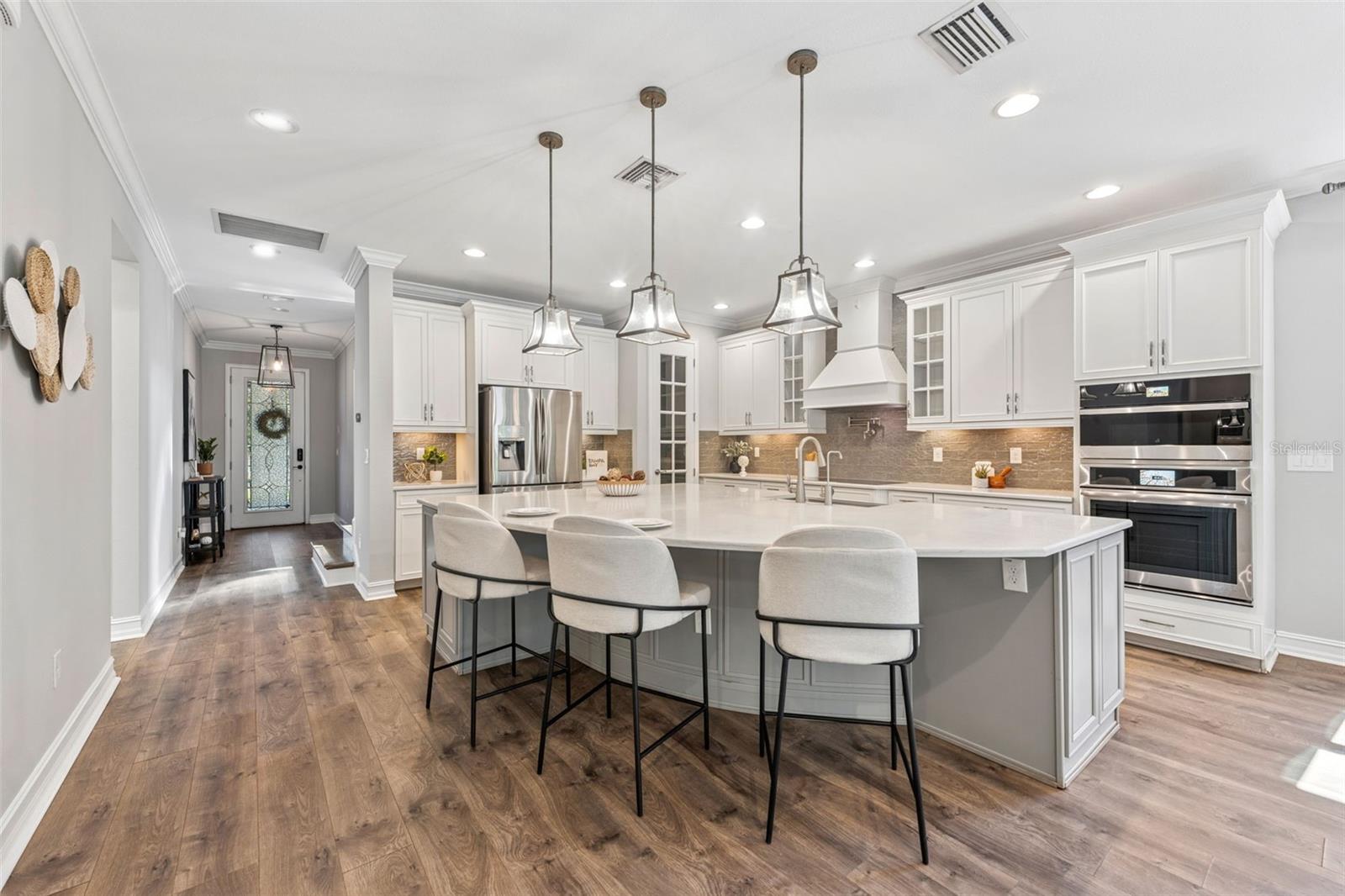 Inside, you'll find an open and airy floor plan featuring upgraded finishes at every turn. The gourmet kitchen is a showstopper, equipped with high-end stainless steel appliances, a spacious island, custom vent hood, pot fill, quartz countertops, and a walk-in pantry with custom glass door--perfect for cooking, entertaining, or casual family dining. One of the standout features of this home is the first-floor primary retreat. Spacious and serene, it offers a peaceful escape with a spa-like en-suite bath and walk-in closet.