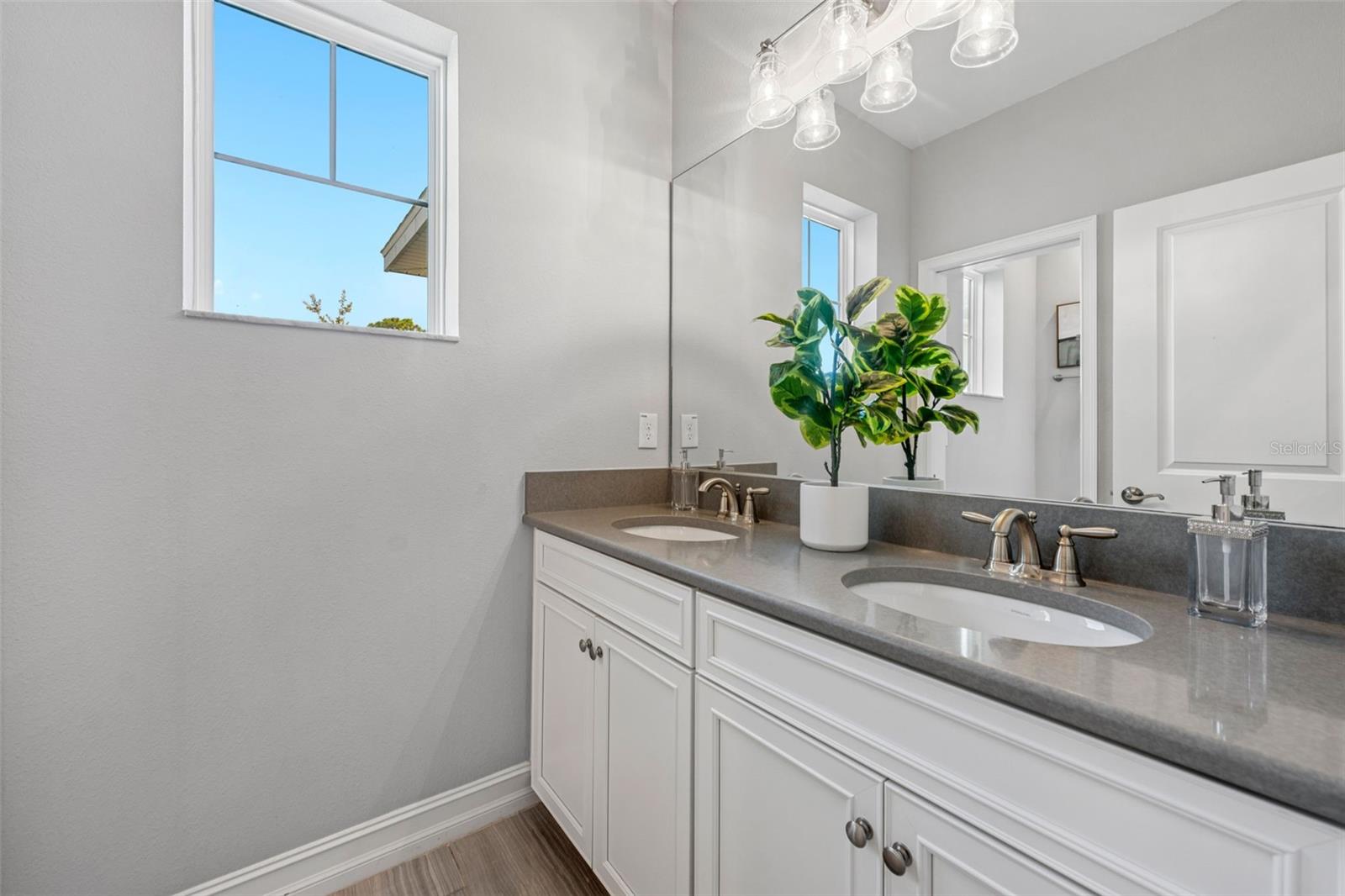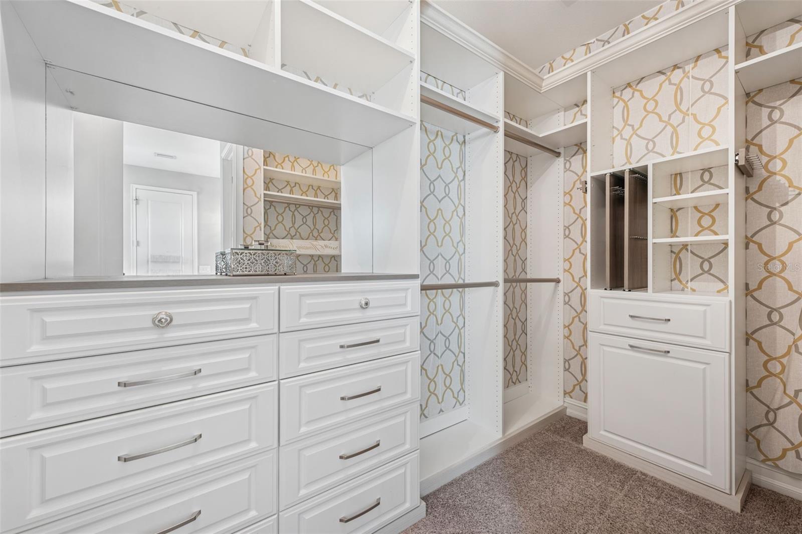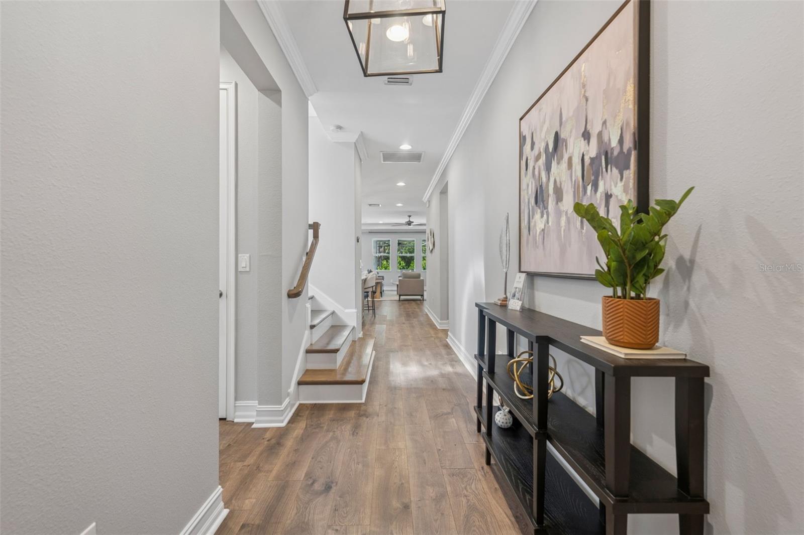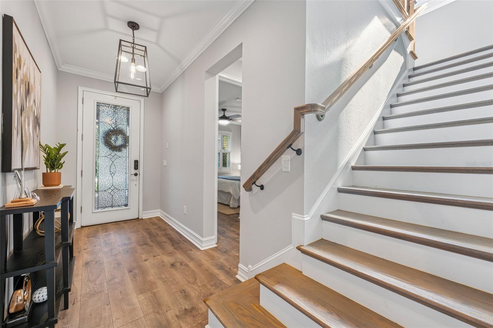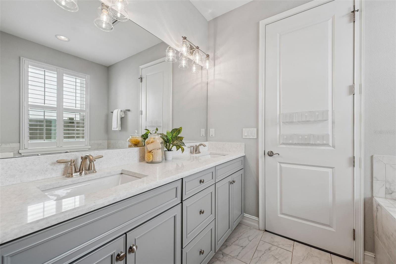 Inside, you'll find an open and airy floor plan featuring upgraded finishes at every turn. The gourmet kitchen is a showstopper, equipped with high-end stainless steel appliances, a spacious island, custom vent hood, pot fill, quartz countertops, and a walk-in pantry with custom glass door--perfect for cooking, entertaining, or casual family dining. One of the standout features of this home is the first-floor primary retreat. Spacious and serene, it offers a peaceful escape with a spa-like en-suite bath and walk-in closet.