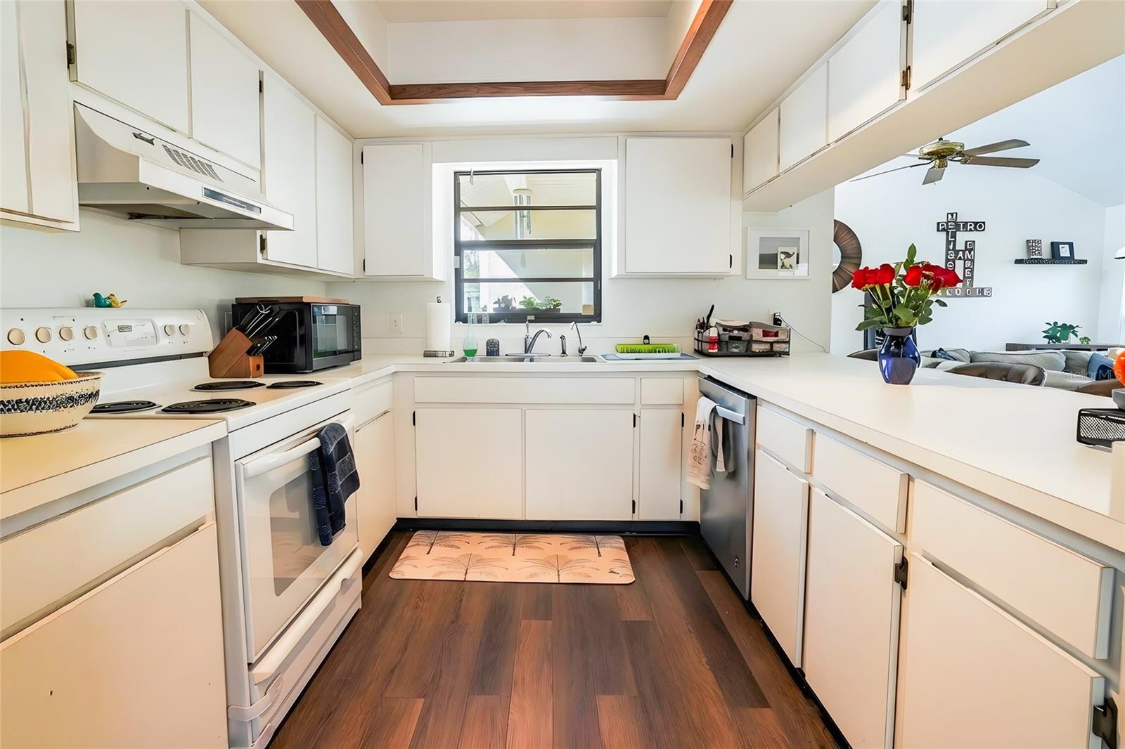 The kitchen is thoughtfully designed with ample cabinetry, a breakfast bar for casual dining, and a functional layout that overlooks the main living area, making it ideal for gatherings. Just beyond, the outdoor space truly shines. The private pool is surrounded by mature landscaping and tropical greenery, offering a serene backyard retreat perfect for relaxing weekends, entertaining guests, or enjoying Florida's year-round sunshine.